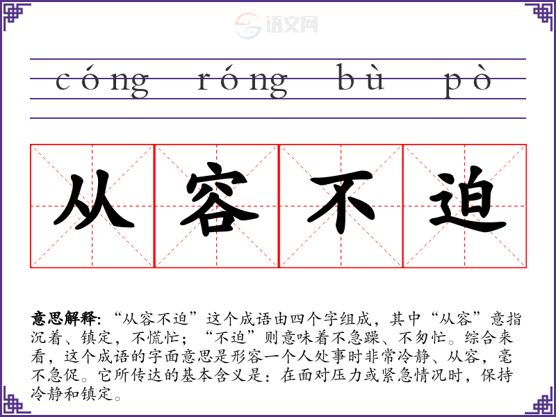 “从容不迫”这个成语由四个字组成,其中“从容”意指沉着、镇定,不慌忙;“不迫”则意味着不急躁、不匆忙。综合来看,这个成语的字面意思是形容一个人处事时非常冷静、从容,毫不急促。它所传达的基本含义是:在面对压力或紧急情况时,保持冷静和镇定。