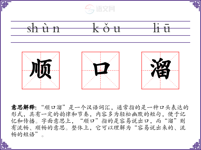 “顺口溜”是一个汉语词汇,通常指的是一种口头表达的形式,具有一定的韵律和节奏,内容多为轻松幽默的短句,便于记忆和传播。字面意思上,“顺口”指的是容易说出口,而“溜”则有流畅、顺畅的意思。整体上,它可以理解为“容易说出来的、流畅的短语”。