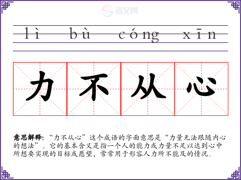 “力不从心”这个成语的字面意思是“力量无法跟随内心的想法”。它的基本含义是指一个人的能力或力量不足以达到心中所想要实现的目标或愿望,常常用于形容人力所不能及的情况。