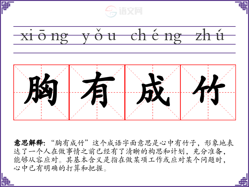 “胸有成竹”这个成语字面意思是心中有竹子,形象地表达了一个人在做事情之前已经有了清晰的构思和计划,充分准备,能够从容应对。其基本含义是指在做某项工作或应对某个问题时,心中已有明确的打算和把握。