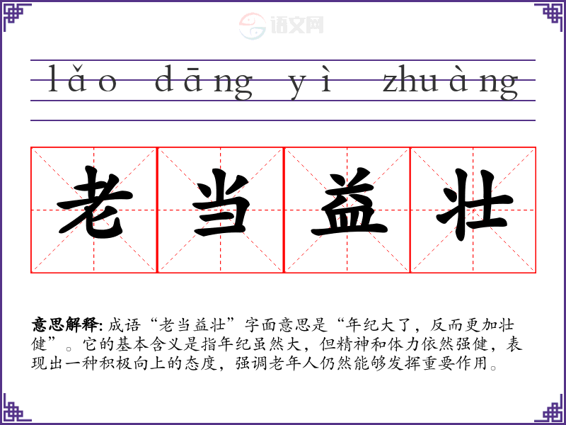 成语“老当益壮”字面意思是“年纪大了,反而更加壮健”。它的基本含义是指年纪虽然大,但精神和体力依然强健,表现出一种积极向上的态度,强调老年人仍然能够发挥重要作用。