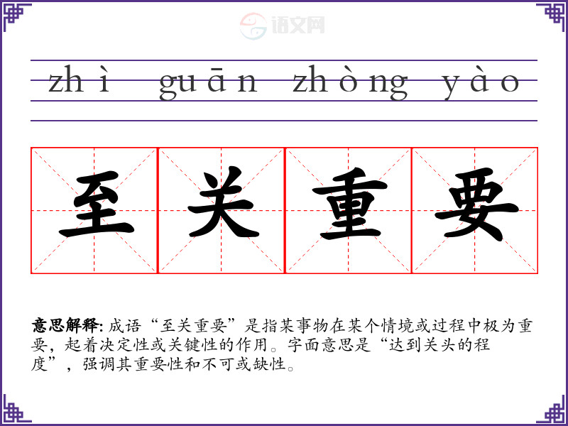 成语“至关重要”是指某事物在某个情境或过程中极为重要,起着决定性或关键性的作用。字面意思是“达到关头的程度”,强调其重要性和不可或缺性。