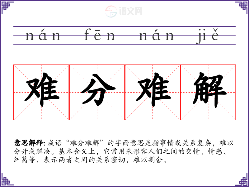 成语“难分难解”的字面意思是指事情或关系复杂,难以分开或解决。基本含义上,它常用来形容人们之间的交情、情感、纠葛等,表示两者之间的关系密切,难以割舍。