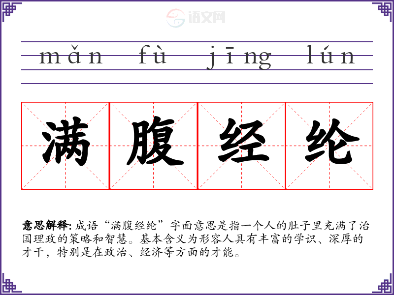 成语“满腹经纶”字面意思是指一个人的肚子里充满了治国理政的策略和智慧。基本含义为形容人具有丰富的学识、深厚的才干,特别是在政治、经济等方面的才能。