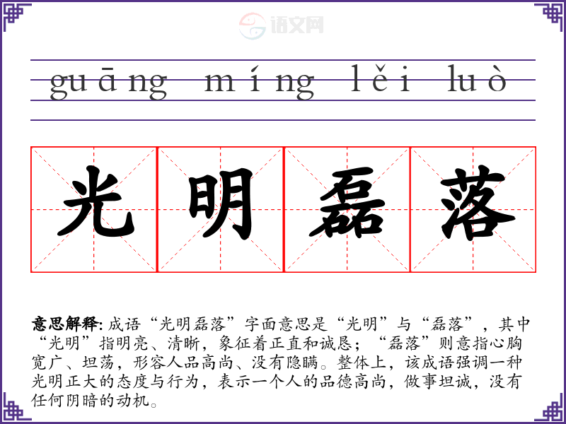 成语“光明磊落”字面意思是“光明”与“磊落”,其中“光明”指明亮、清晰,象征着正直和诚恳;“磊落”则意指心胸宽广、坦荡,形容人品高尚、没有隐瞒。整体上,该成语强调一种光明正大的态度与行为,表示一个人的品德高尚,做事坦诚,没有任何阴暗的动机。