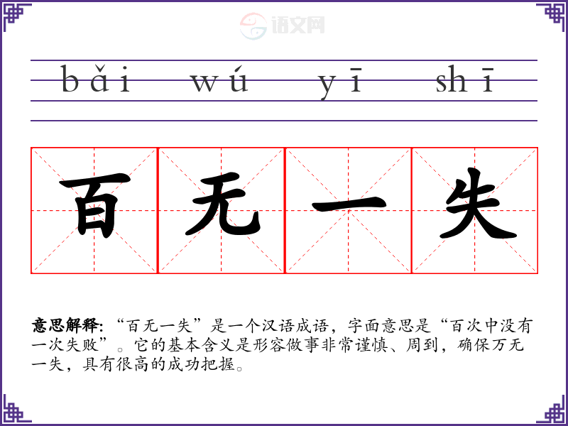 “百无一失”是一个汉语成语,字面意思是“百次中没有一次失败”。它的基本含义是形容做事非常谨慎、周到,确保万无一失,具有很高的成功把握。