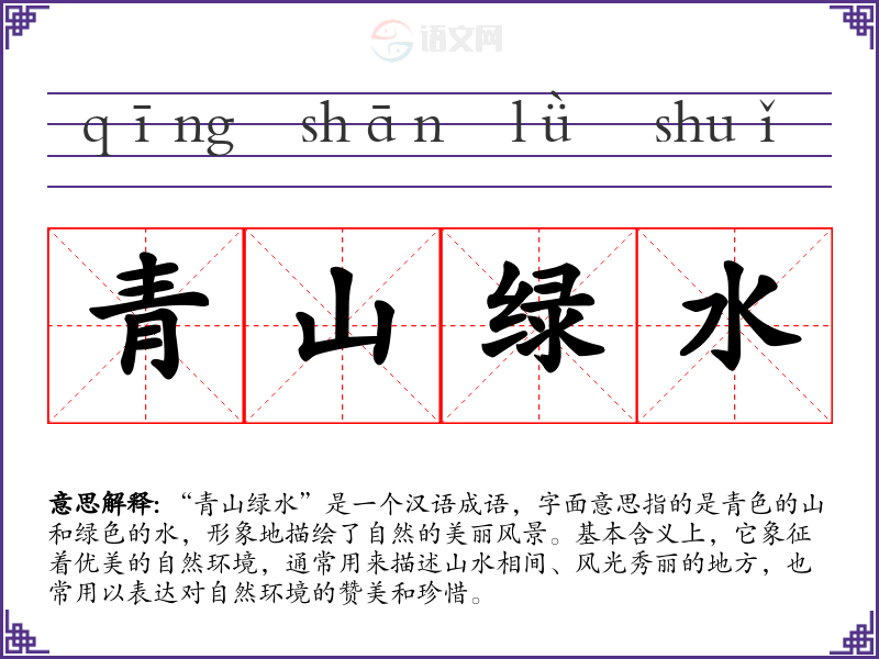 “青山绿水”是一个汉语成语,字面意思指的是青色的山和绿色的水,形象地描绘了自然的美丽风景。基本含义上,它象征着优美的自然环境,通常用来描述山水相间、风光秀丽的地方,也常用以表达对自然环境的赞美和珍惜。