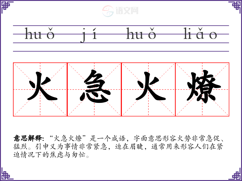 “火急火燎”是一个成语,字面意思形容火势非常急促、猛烈。引申义为事情非常紧急,迫在眉睫,通常用来形容人们在紧迫情况下的焦虑与匆忙。