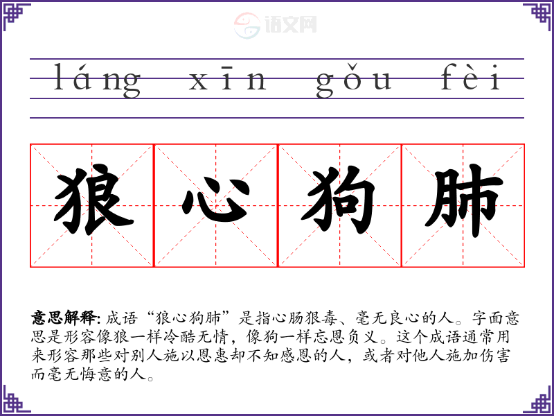 成语“狼心狗肺”是指心肠狠毒、毫无良心的人。字面意思是形容像狼一样冷酷无情,像狗一样忘恩负义。这个成语通常用来形容那些对别人施以恩惠却不知感恩的人,或者对他人施加伤害而毫无悔意的人。