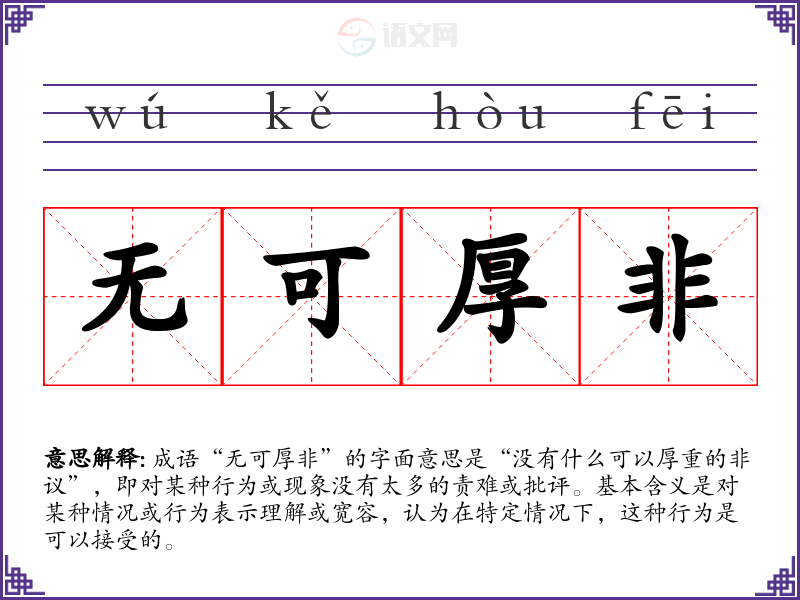 成语“无可厚非”的字面意思是“没有什么可以厚重的非议”,即对某种行为或现象没有太多的责难或批评。基本含义是对某种情况或行为表示理解或宽容,认为在特定情况下,这种行为是可以接受的。