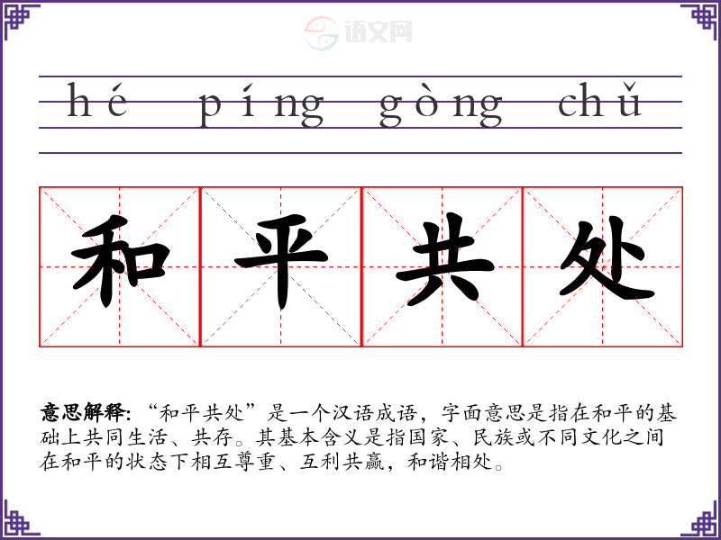 “和平共处”是一个汉语成语,字面意思是指在和平的基础上共同生活、共存。其基本含义是指国家、民族或不同文化之间在和平的状态下相互尊重、互利共赢,和谐相处。