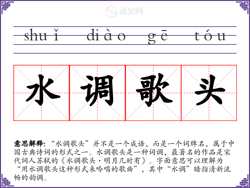 “水调歌头”并不是一个成语,而是一个词牌名,属于**古典诗词的形式之一。水调歌头是一种词调,最著名的作品是宋代词人苏轼的《水调歌头·明月几时有》。字面意思可以理解为“用水调歌头这种形式来吟唱的歌曲”,其中“水调”暗指清新流畅的韵调。