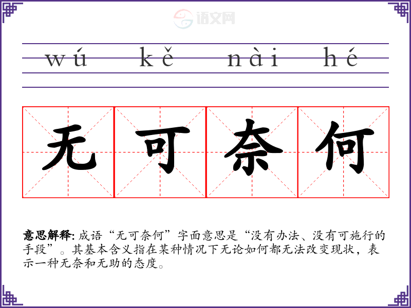 成语“无可奈何”字面意思是“没有办法、没有可施行的手段”。其基本含义指在某种情况下无论如何都无法改变现状,表示一种无奈和无助的态度。