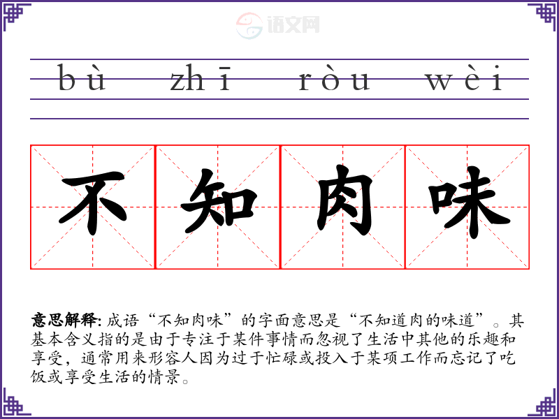 成语“不知肉味”的字面意思是“不知道肉的味道”。其基本含义指的是由于专注于某件事情而忽视了生活中其他的乐趣和享受,通常用来形容人因为过于忙碌或投入于某项工作而忘记了吃饭或享受生活的情景。
