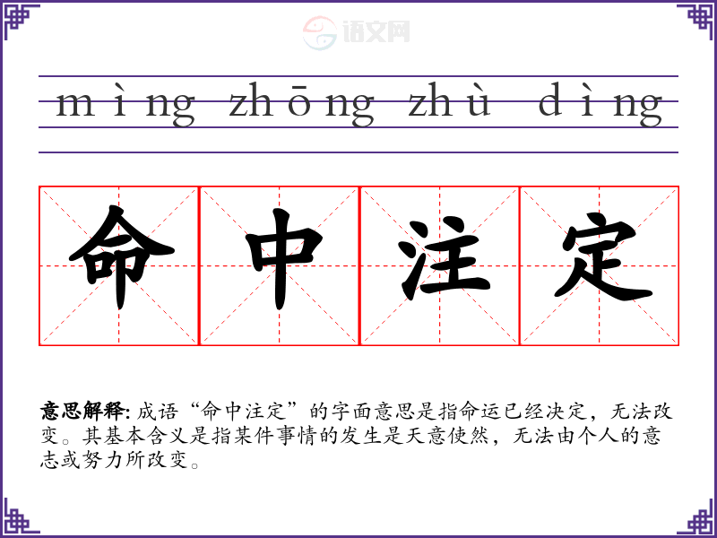 成语“命中注定”的字面意思是指命运已经决定,无法改变。其基本含义是指某件事情的发生是天意使然,无法由个人的意志或努力所改变。