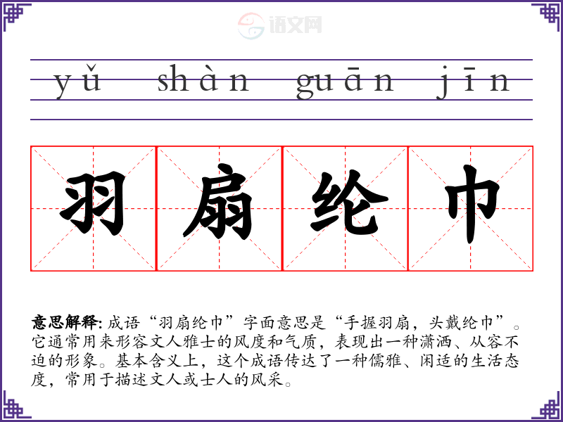 成语“羽扇纶巾”字面意思是“手握羽扇,头戴纶巾”。它通常用来形容文人雅士的风度和气质,表现出一种潇洒、从容不迫的形象。基本含义上,这个成语传达了一种儒雅、闲适的生活态度,常用于描述文人或士人的风采。