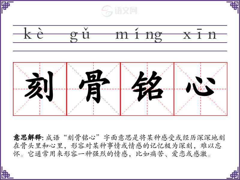 成语“刻骨铭心”字面意思是将某种感受或经历深深地刻在骨头里和心里,形容对某种事情或情感的记忆极为深刻,难以忘怀。它通常用来形容一种强烈的情感,比如痛苦、爱恋或感激。