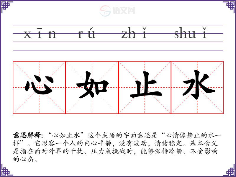 “心如止水”这个成语的字面意思是“心情像静止的水一样”。它形容一个人的内心平静,没有波动,情绪稳定。基本含义是指在面对外界的干扰、压力或挑战时,能够保持冷静、不受影响的心态。