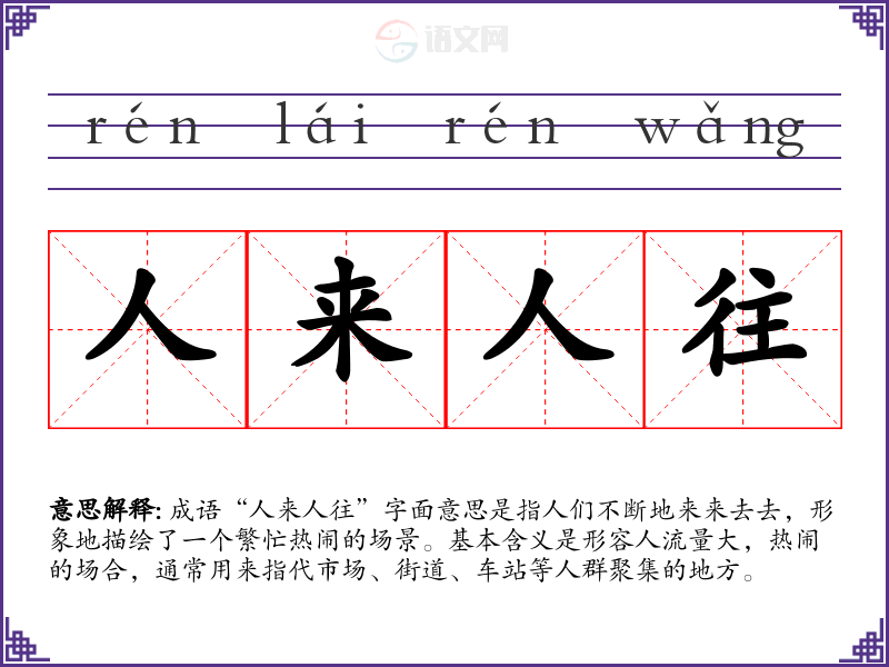 成语“人来人往”字面意思是指人们不断地来来去去,形象地描绘了一个繁忙热闹的场景。基本含义是形容人流量大,热闹的场合,通常用来指代市场、街道、车站等人群聚集的地方。