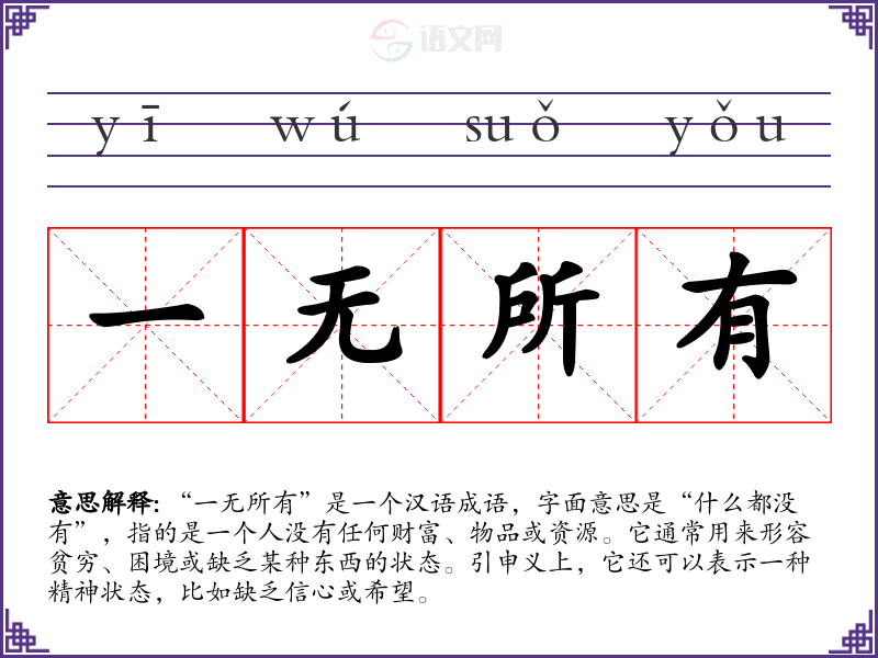 “一无所有”是一个汉语成语,字面意思是“什么都没有”,指的是一个人没有任何财富、物品或资源。它通常用来形容贫穷、困境或缺乏某种东西的状态。引申义上,它还可以表示一种精神状态,比如缺乏信心或希望。