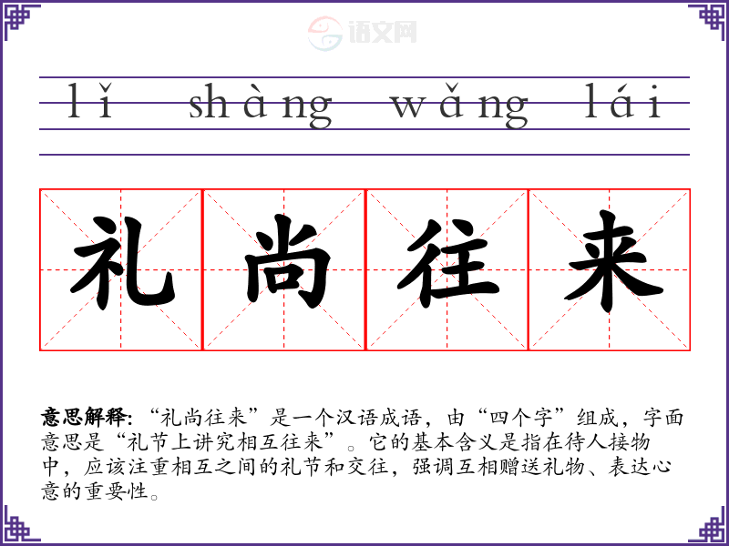 “礼尚往来”是一个汉语成语,由“四个字”组成,字面意思是“礼节上讲究相互往来”。它的基本含义是指在待人接物中,应该注重相互之间的礼节和交往,强调互相赠送礼物、表达心意的重要性。