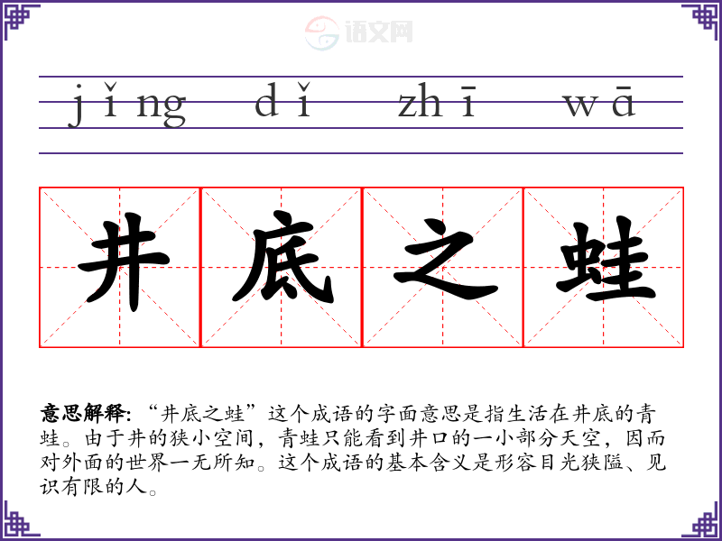 故事:很久以前,一只生活在废井里从没有跳出井来的青蛙,有吃有喝,觉得很满足。一天他好奇问路过的海龟天有多大。海龟告诉他天是如何如何广阔,青蛙不能理解海龟所描述的,总认为天只不过井口那么大