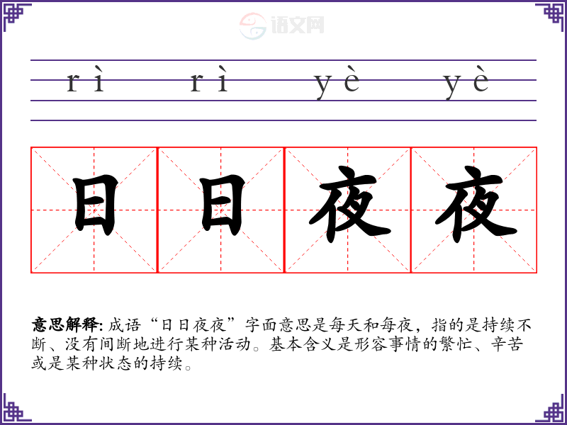成语“日日夜夜”字面意思是每天和每夜,指的是持续不断、没有间断地进行某种活动。基本含义是形容事情的繁忙、辛苦或是某种状态的持续。