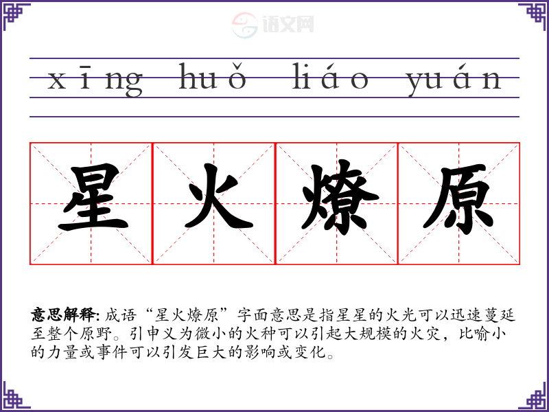 成语“星火燎原”字面意思是指星星的火光可以迅速蔓延至整个原野。引申义为微小的火种可以引起*的火灾,比喻小的力量或可以引发巨大的影响或变化。