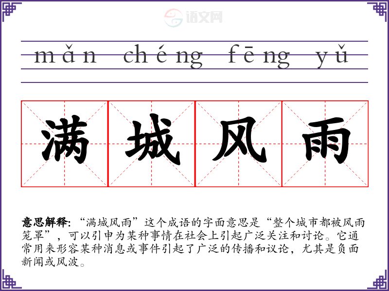 “满城风雨”这个成语的字面意思是“整个城市都被风雨笼罩”,可以引申为某种事情在社会上引起广泛关注和讨论。它通常用来形容某种消息或**引起了广泛的传播和议论,尤其是负面新闻或风波。