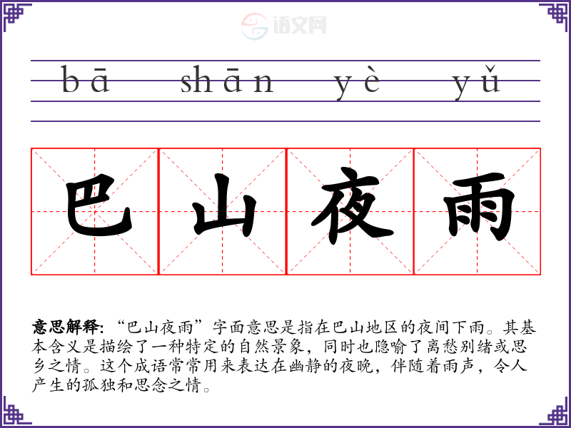 “巴山夜雨”字面意思是指在巴山地区的夜间下雨。其基本含义是描绘了一种特定的自然景象,同时也隐喻了离愁别绪或思乡之情。这个成语常常用来表达在幽静的夜晚,伴随着雨声,令人产生的孤独和思念之情。