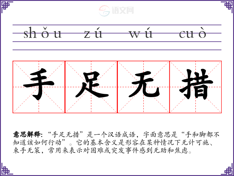 “手足无措”是一个汉语成语,字面意思是“手和脚都不知道该如何行动”。它的基本含义是形容在某种情况下无计可施、束手无策,常用来表示对困难或突发**感到无助和焦虑。