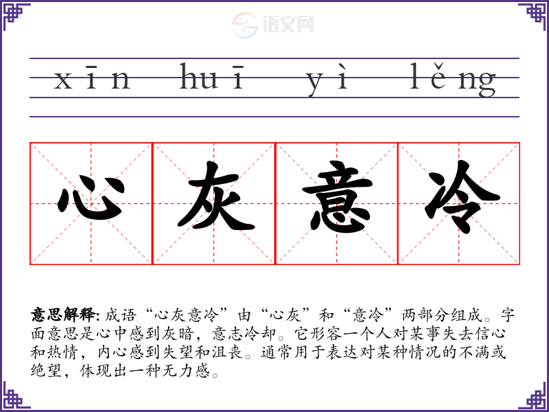 - 同义成语:失望透顶、心如死灰、丧气失望。它们都表达了对事物失去信心的感受,但“心灰意冷”更强调内心的冷漠与无奈。