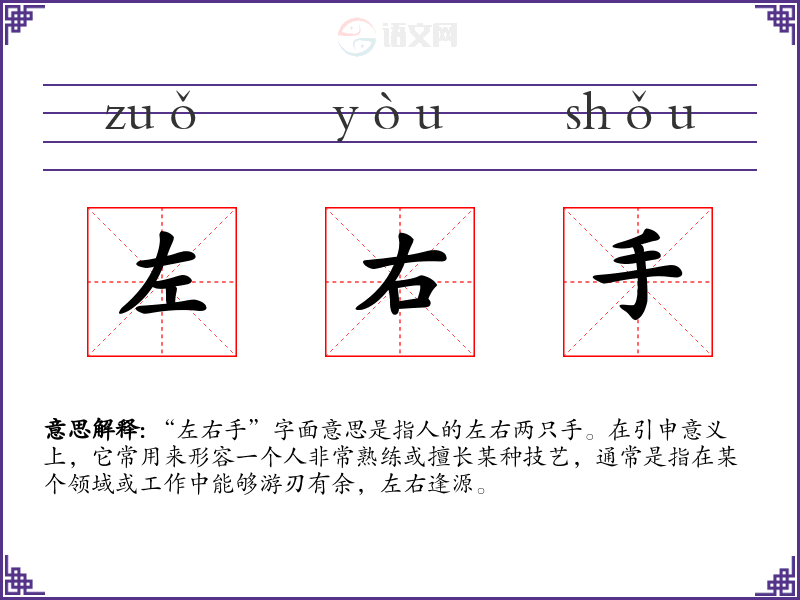 “左右手”字面意思是指人的左右两只手。在引申意义上,它常用来形容一个人非常熟练或擅长某种技艺,通常是指在某个领域或工作中能够游刃有余,左右逢源。
