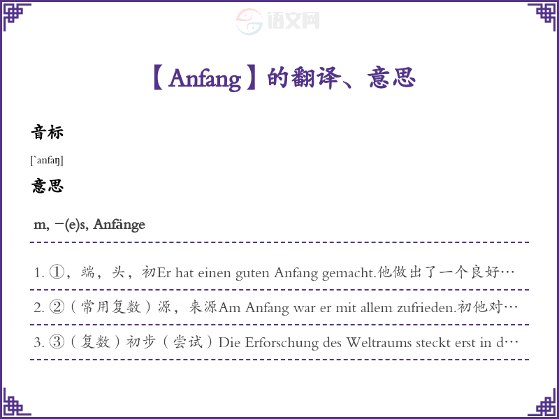 ①,端,头,初Er hat einen guten Anfang gemacht.他做出了一个良好的端。Aller Anfang ist schwer.万事头难。