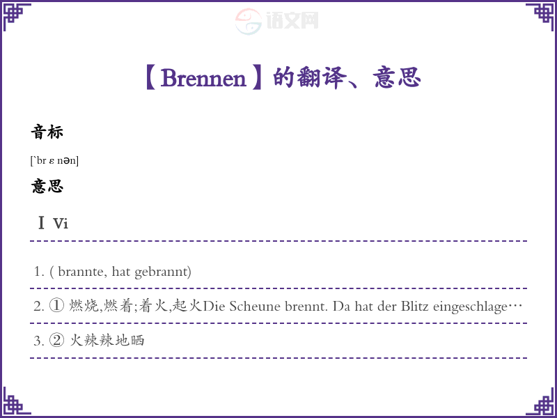 ⑨ 渴望,热望,急于Er brennt darauf,seinen Freund zu besuchen. 他很渴望去看望他的朋友。