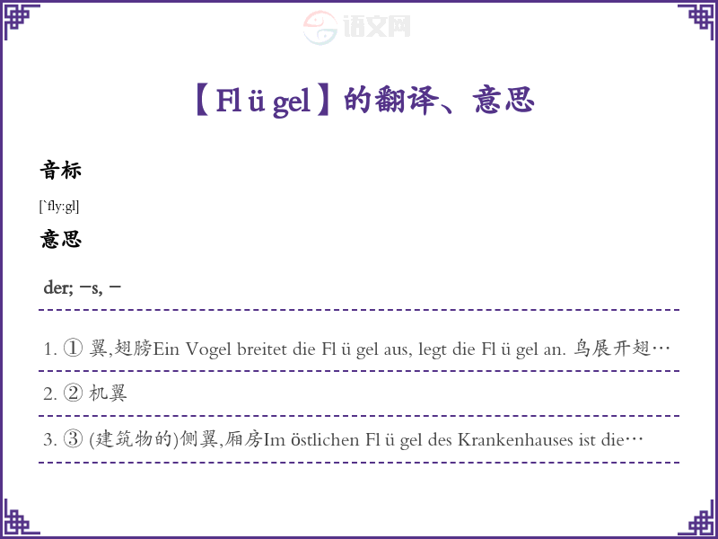 ① 翼,翅膀Ein Vogel breitet die Flügel aus, legt die Flügel an. 鸟展开翅膀,收拢翅膀。