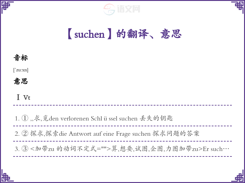 ② 探求,探索die Antwort auf eine Frage suchen 探求问题的答案
