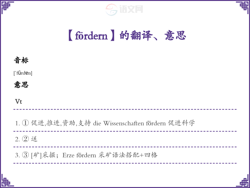 ① 促进,推进,资助,支持 die Wissenschaften fördern 促进科学