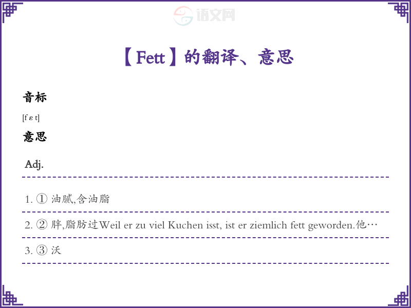 ② 胖,脂肪过Weil er zu viel Kuchen isst, ist er ziemlich fett geworden.他因吃太糕点,已经变得相当胖了。