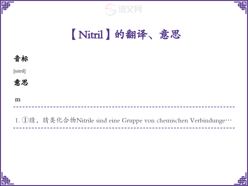 ①腈,腈类化合物Nitrile sind eine Gruppe von chemischen Verbindungen, die eine oder mehrere Nitrilgruppen enthalten.