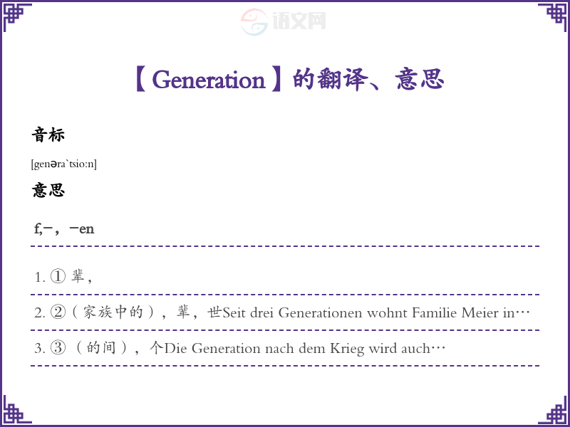 ②(家族中的),辈,世Seit drei Generationen wohnt Familie Meier in München.迈耶尔家三都居住在慕尼黑。von Generation zu Generation世世