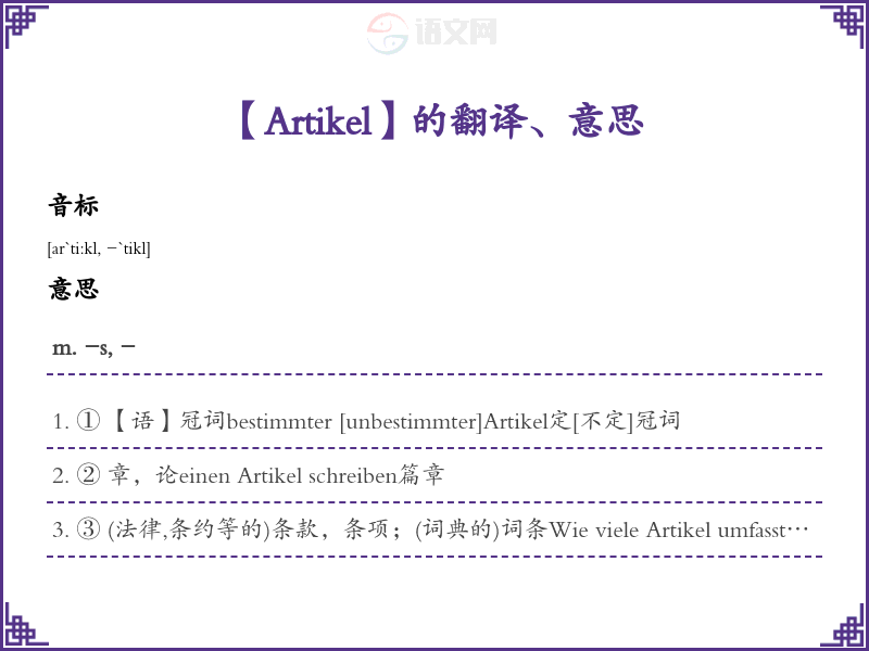 ③ (法律,条约等的)条款,条项;(词典的)词条Wie viele Artikel umfasst eine Lieferung?份册(词典)有多少词条?