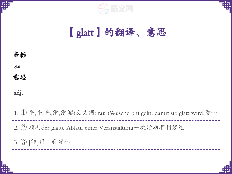① 平,平,光,滑,滑溜(反义词: rau )Wäsche bügeln, damit sie glatt wird.熨烫衣服使其平整