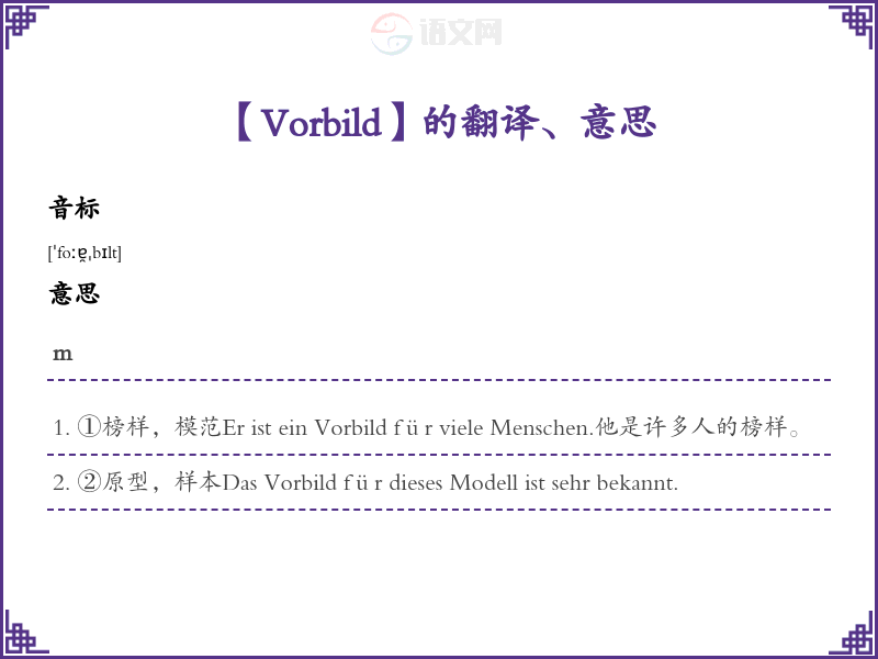 ①榜样,模范Er ist ein Vorbild für viele Menschen.他是许多人的榜样。