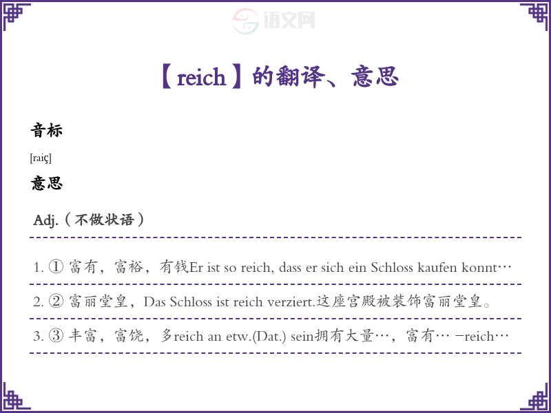 ③ 丰富,富饶,多reich an etw.(Dat.) sein拥有大量…,富有… -reich (做后缀,构成形容词)(含)…多,…丰富vitaminreich维生素丰富schneereich多雪