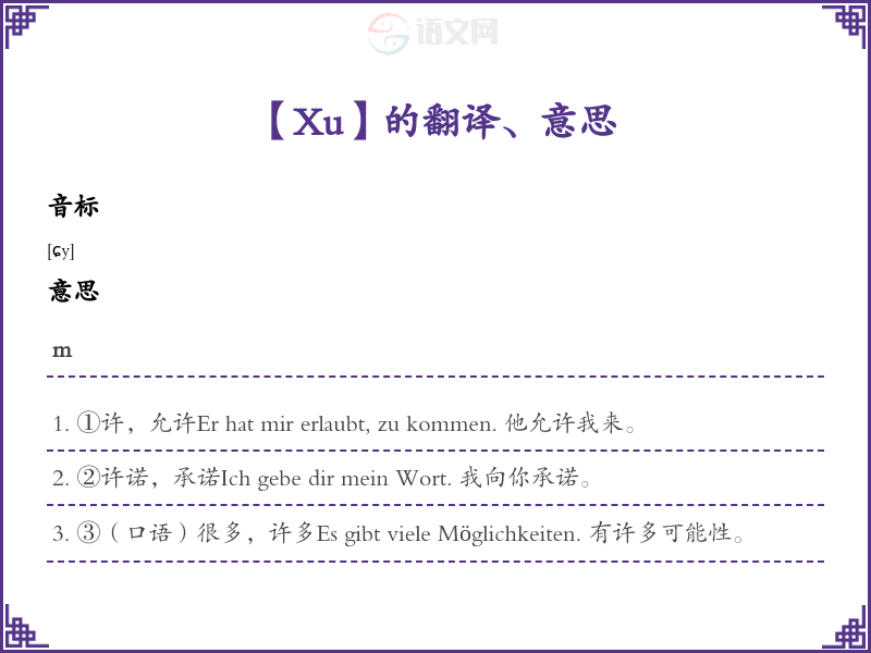 ①许,允许Er hat mir erlaubt, zu kommen. 他允许我来。