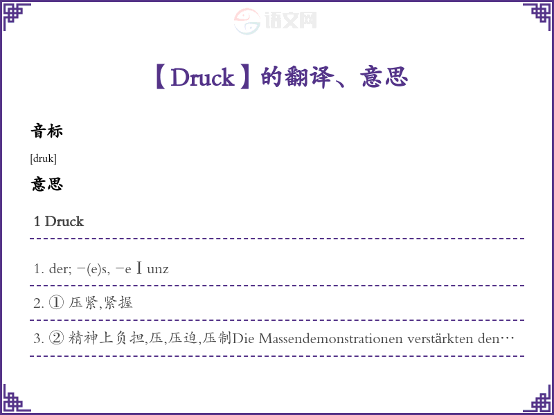 ③ 压,按Ein leichter Druck auf den Knopf genügt. 一下按钮就行了。Mit einem Druck auf diesen Knopf kann man das Licht ausmachen.按下这个按钮就能关闭灯。2 Druckder; -(e)s, -e