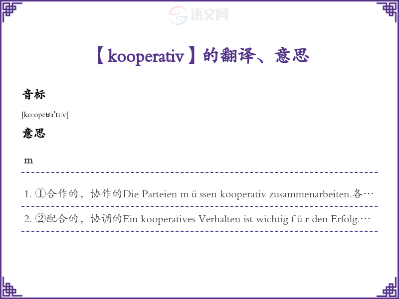 ②配合的,协调的Ein kooperatives Verhalten ist wichtig für den Erfolg.配合的行为对成功很重要。