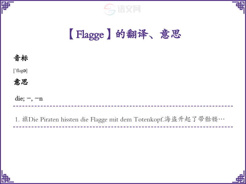 旗Die Piraten hissten die Flagge mit dem Totenkopf.海盗升起了带骷髅图案的旗子。Der Tanker fährt unter libanesischer Flagge.这条油轮挂着黎巴嫩的国旗航行。