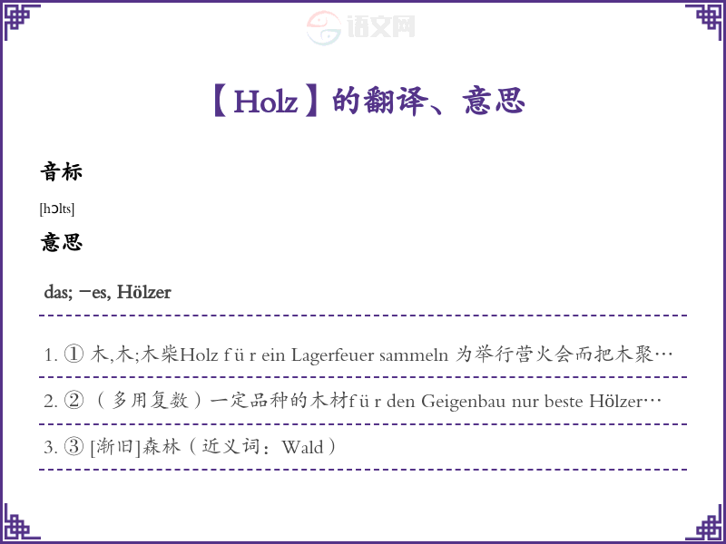 ① 木,木;木柴Holz für ein Lagerfeuer sammeln 为举行营火会而把木聚集起来。